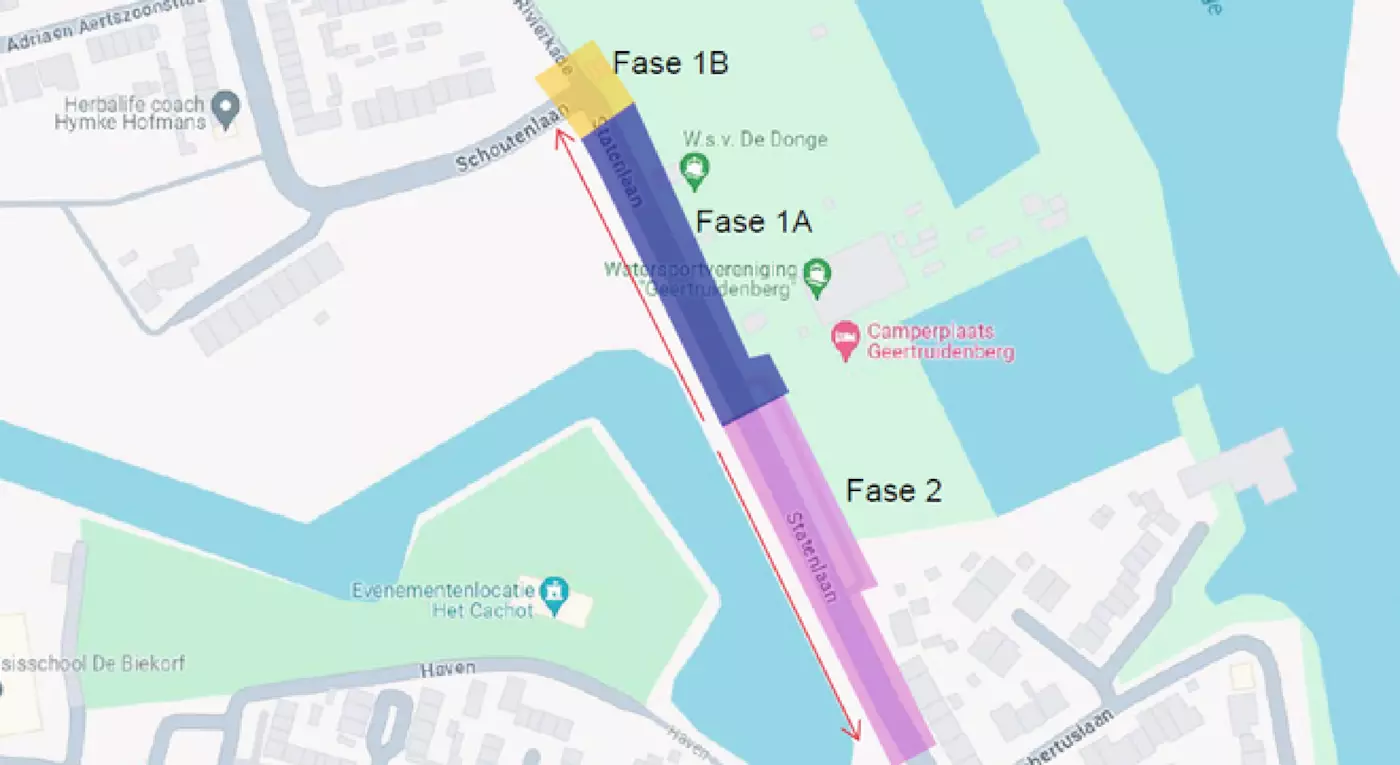 De werkzaamheden zijn opgedeeld in 2 hoofdfases. Fase 1 is gestart en duurt tot eind oktober. In deze fase wordt vanaf het laagste punt (rioolgemaal) het riool richting de Rivierkade/Schoutenlaan vergroot en vernieuwd. Vervolgens starten we met fase 2 en werken we vanaf het rioolgemaal tot Statenlaan 33. Deze fase duurt tot begin 2025.